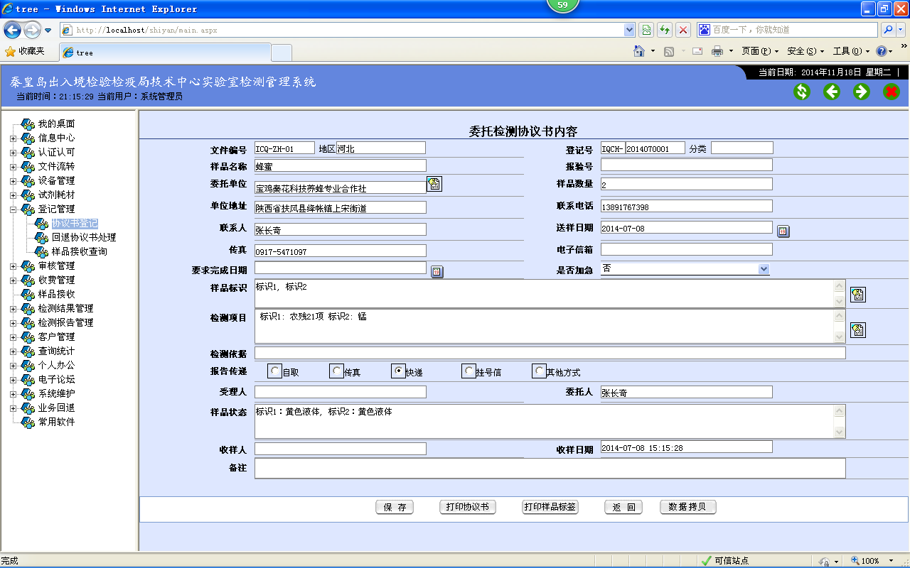 (1)基本信息:包括登记号、样品总称、报验单位和编号、送检部门、联系人、联系电话、传真、电子邮箱、要求完成日期、是否加急、收样日期、收样人、备注等信息。