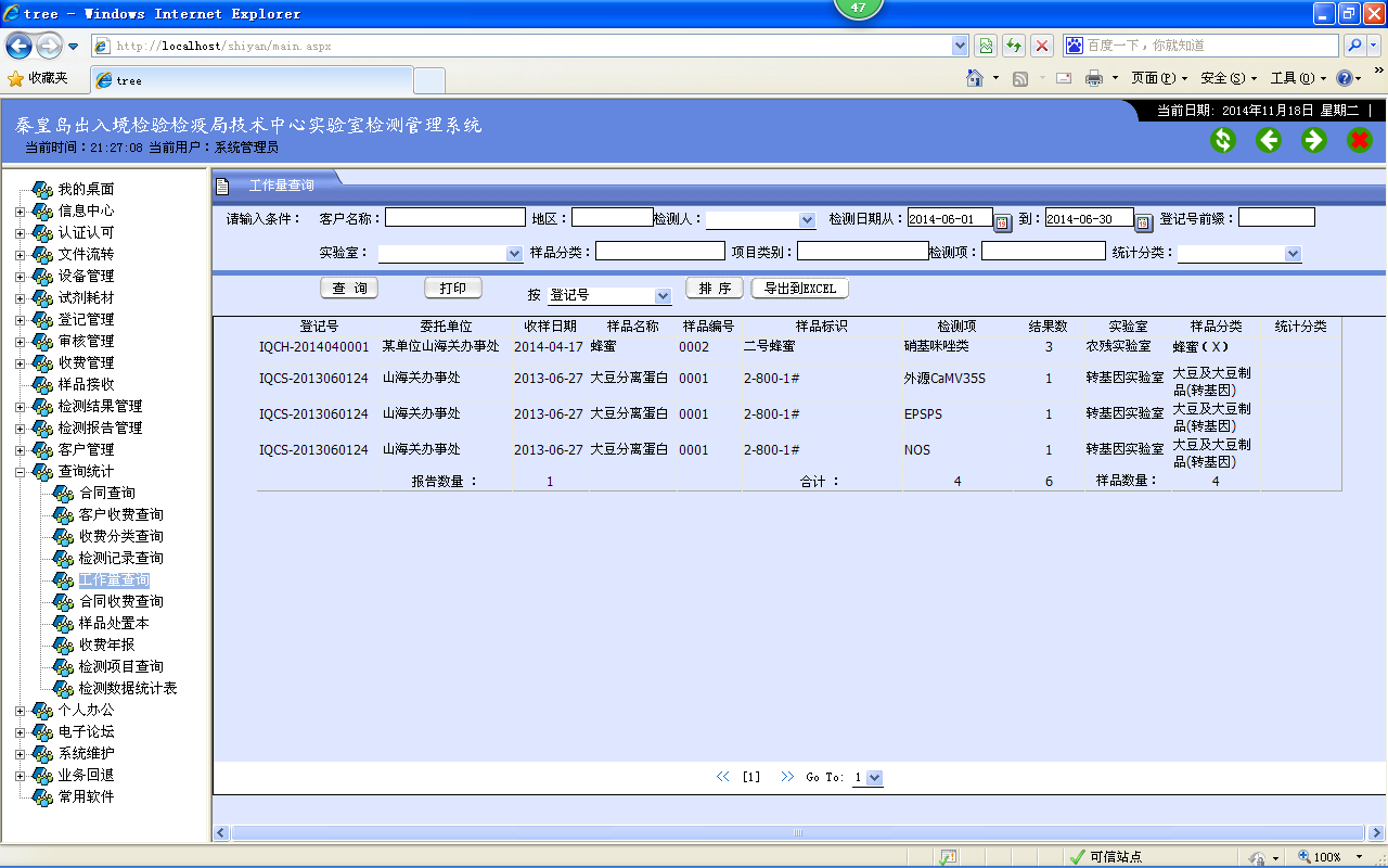 12、查询统计:根据用户选择的查询条件,查询检测任务列表,并可了解每个检测任务的进展情况,可以按科室、检测员、检测仪器、样品种类、检测项目等条件汇总一段时间内的检测任务、收费金额等数据。